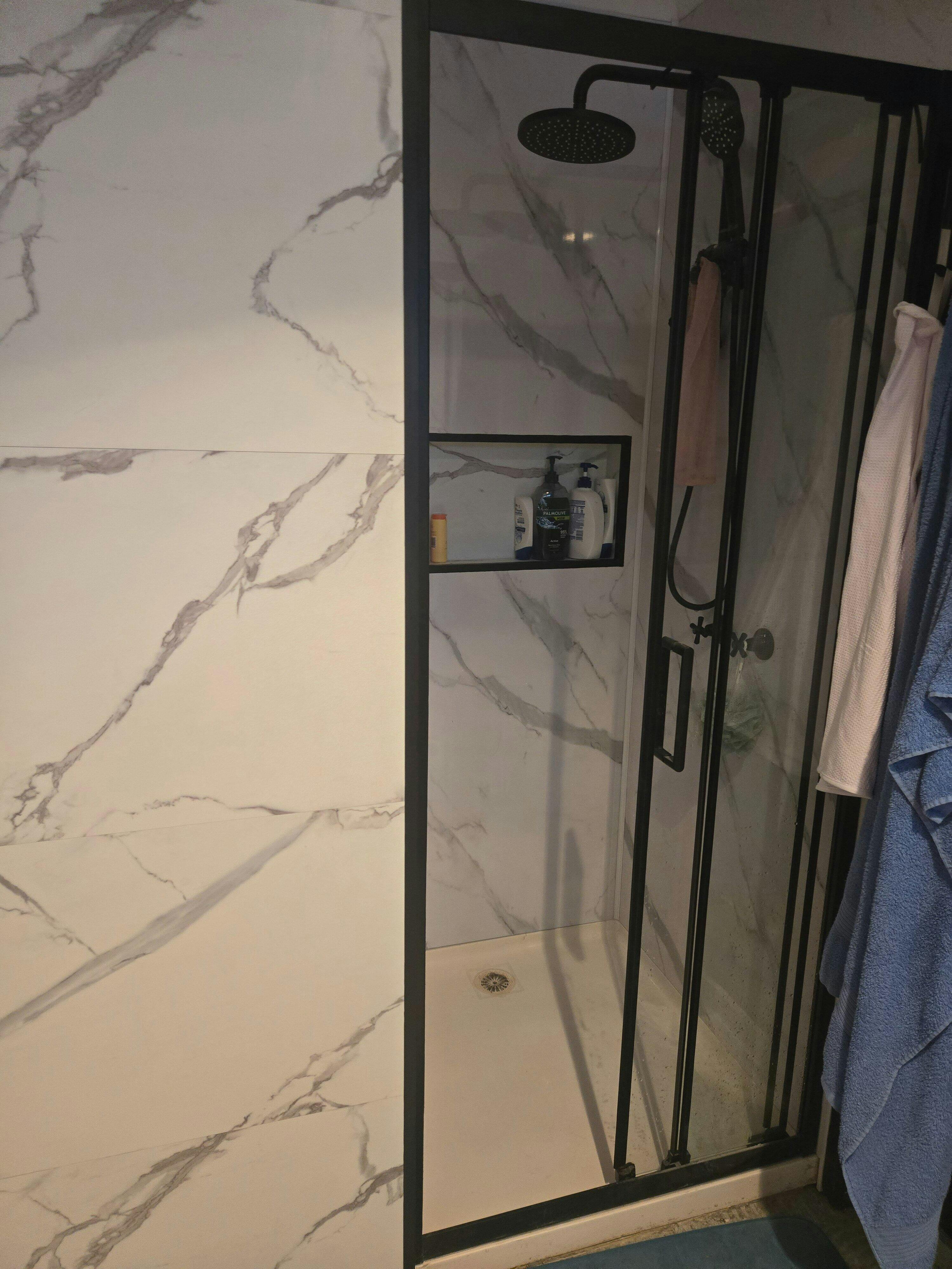 By using our external corner trims, you can create a matching shower niche with the panels.